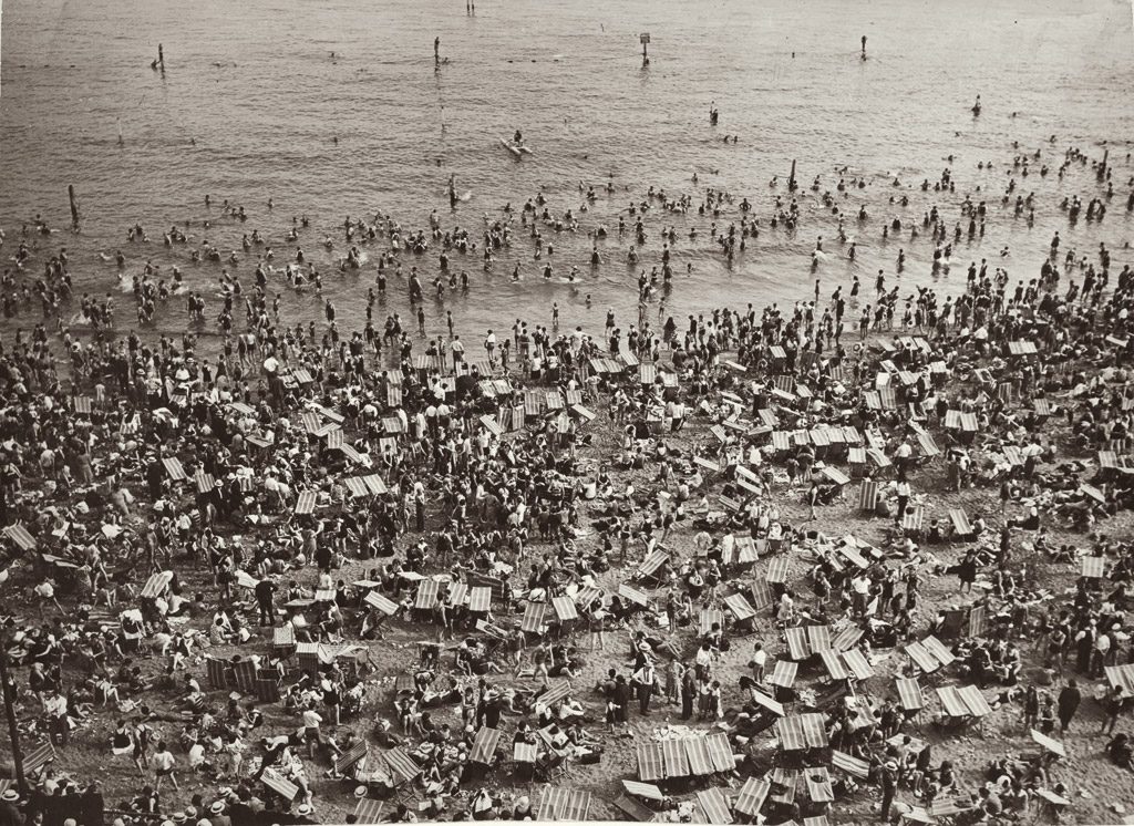 L’été venu, les plages de Coney Island sont prises d’assaut par les touristes et les immigrés qui fuient la chaleur étouffante de New York. Dans les années 1920, la popularité de cette destination est au plus haut. Cette bulle d’insouciance, qui précède le krach d’octobre 1929, témoigne des prémisses du tourisme de masse. Dans cette image prise en plongée accentuant l’effet de saturation de la foule, on ne distingue aucun visage mais le portrait de ces anonymes en dit long sur la société américaine.