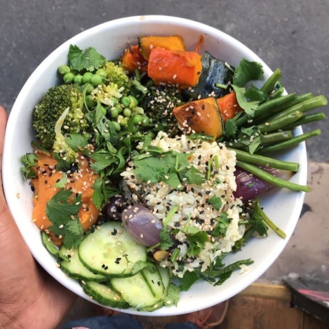 Jah Jah, c’est le deuxième bébé de l’équipe du Tricycle, qui nous avait déjà ouvert les portes d’un monde nouveau avec leurs hot dogs vegan. Et ici ? C’est grand, il y a de la place et une carte de délices taillée pour tout partager : choux fleurs panés sauce barbecue, des légumes et des fraises roulés dans une feuille d’algues, façon maki, qu’on trempe dans une sauce coco cacahuète, des bananes plantain sauce avocat et… leur hot dog coriandre saucisse végétale. Tu n’aimes pas partager ? Commande un bol « cru » ou « froid » en solo. Bilan : c’est vraiment bon et ça nous prouve une nouvelle fois qu’on peut être vegan, adorer la bouffe et ne pas bouder la quantité. PS: ici on sait, vivre, on prend son temps, donc pas forcément LE meilleur plan quand on est pressé.