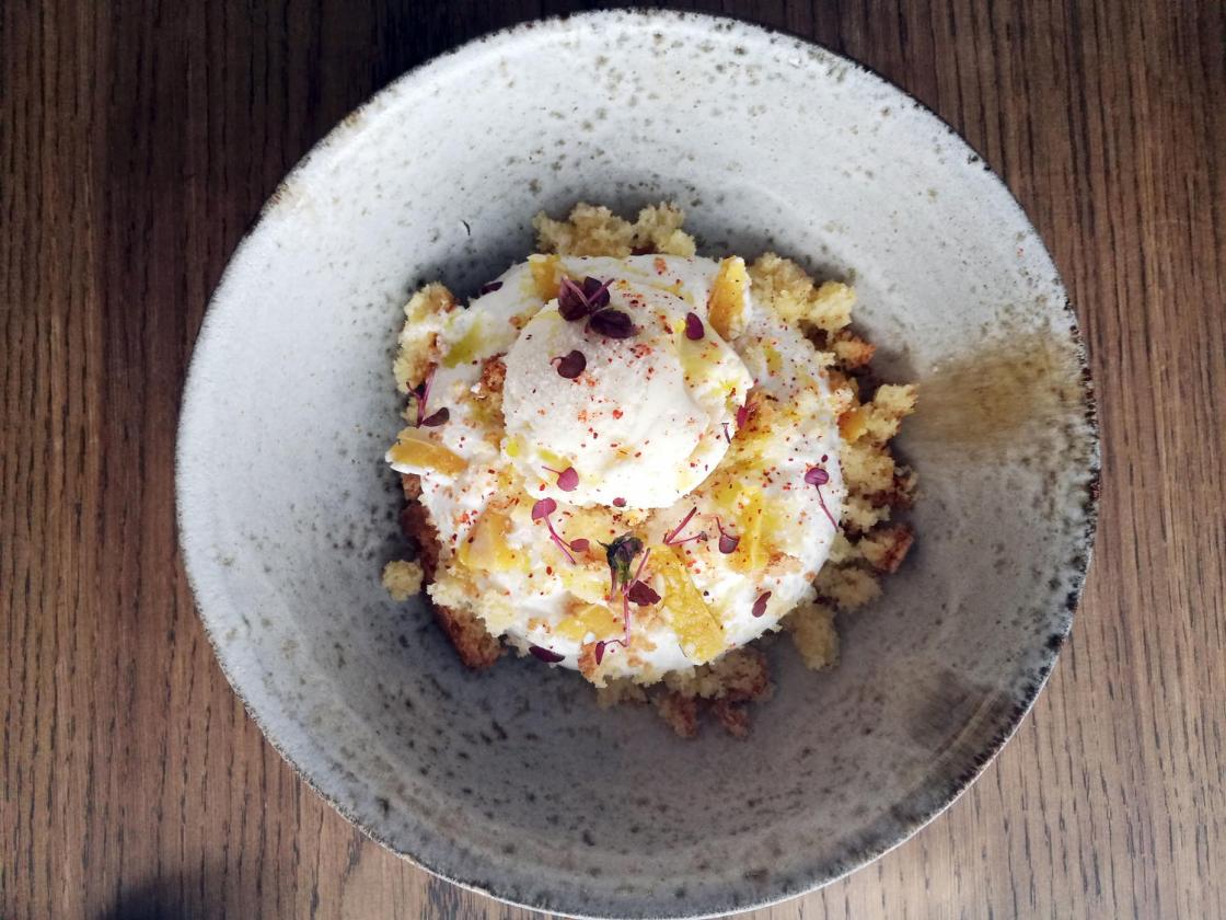 « Po-po-pooo ! », c’est ce qu’on s’écrie en voyant débarquer face à nous l’œuf mayo qui met k.o tous tes clichés sur ce plat de cantine vu et revu. On trempe compulsivement la brioche dans le jaune puis le blanc aérien et on s’assure qu’il n’en reste plus une miette après notre passage. C’est le moment que choisit la daurade à la peau croustillante, flanquée de pickles d’oignons et d’herbes gorgées de soleil, pour débarquer. Alors elle est haute, la barre, quand arrive le dessert mais le coup de foudre est immédiat. Carton plein pour le calisson câlin, planqué entre une brioche imbibée de fleur d’oranger, une boule de glace et du mascarpone tellement léger. On y retourne quand ?