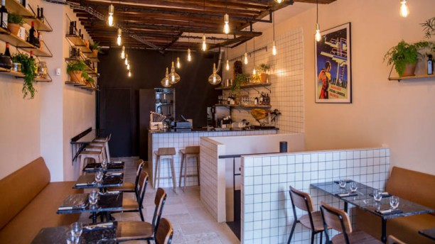 Que la valse (catalane) commence ! À midi, les tomates anciennes au miel débarquent sous nos nez dans de la jolie vaisselle puis on fait la rencontre d’un tartare de bar trèèès rafraîchissant au mojo verde (une sauce poivron coriandre) pendant qu’en face de nous, ça s’envoie du poulet fermier, écrasée de pomme de terre, crème de fromage Manchego sur lequel on louche entre deux bouchées. On finit en beauté sur une note sucrée assez top : des fraises au vin cajolée par de la glace à la vanille. Voilà, on a trouvé notre spot à tapas fins et légers dans le Marais et le plus cool c’est qu’on n’aura pas besoin de vendre un seul organe pour ça.