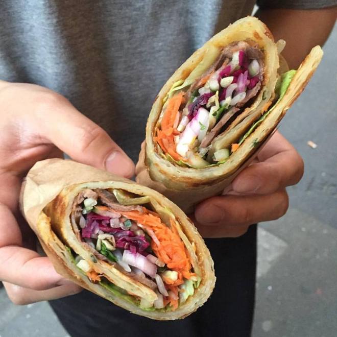 Si on était un jury et qu’on devait retourner nos fauteuils quand un plat tabasse (on tient un concept là, non ?), sachez qu’on se retournerait direct pour la crêpe taïwanaise bien roulée dégotée chez Bopome. Qu’est-ce qu’elle cache ? Du porc bien juteux, de la salade, du chou rouge, des carottes râpées, du concombre, du soja et de la coriandre. Un grand OUI. Surtout, surtout, faites-nous la promesse de ne jamais en repartir sans avoir goûté à une petite dinguerie nommée beignet de patate douce, pas dégoulinant d’huile pour un sou. On te prend dans notre équipe Bopome !