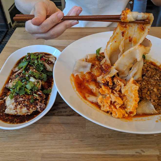 Ne fais pas comme nous : évite de te pointer dans cette cantine chinoise avec un tee-shirt blanc ou le textile s’en souviendra. Vêtu d’une impeccable tenue noire donc, tu seras apte à déguster la spécialité de la maison : les nouilles biang biang. Longues et épaisses comme une ceinture, elles portent le nom du bruit qu’on fait en travaillant la pâte sur le plan de travail. Assez d’infos, place à la dégustation des nouilles XXL arrosées d’une huile de piment, d’œufs brouillés à la tomate et de porc mijoté. Juteuses et réconfortantes, elles nous font dire que toutes les vermicelles qui ont croisé notre chemin avant n’étaient pas à la hauteur. Biang, biang, elles ont tiré droit dans nos cœurs.